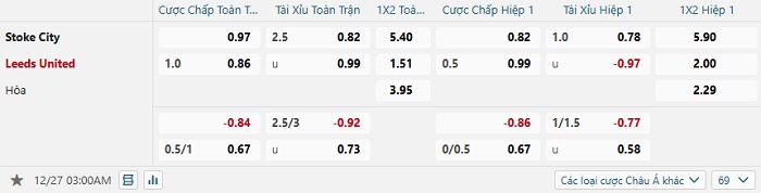 Tip kèo Châu Á hiệp 1 Stoke City vs Leeds