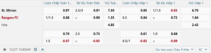 Tip kèo Châu Á full trận St. Mirren vs Rangers