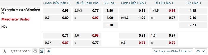 Tip kèo Châu Á hiệp 1 Wolves vs Man United