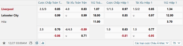 Tip kèo Châu Á full trận Liverpool vs Leicester
