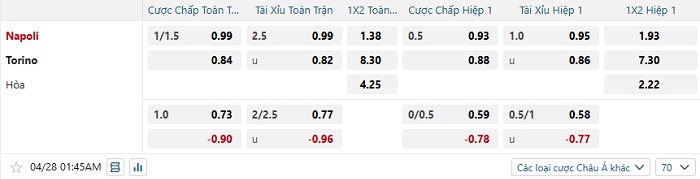 Tip kèo Châu Á hiệp 1 Napoli vs Torino