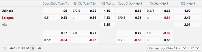 Tip kèo Châu Á full trận Udinese vs Bologna