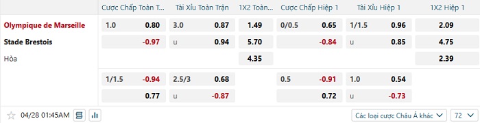 Tip kèo Châu Á full trận Marseille vs Brest