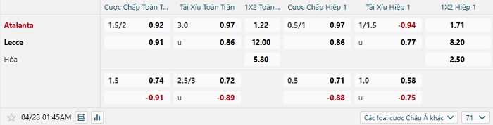 Tip kèo Châu Á hiệp 1 Atalanta vs Lecce