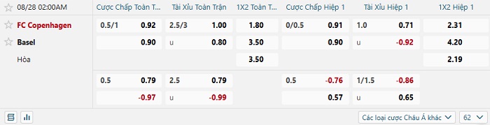 Tip kèo Châu Á full trận Copenhagen vs Basel
