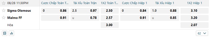 Tip kèo Châu Á hiệp 1 Sigma Olomouc vs Malmo