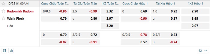 Tip kèo Châu Á hiệp 1 Radomiak Radom vs Wisla Plock