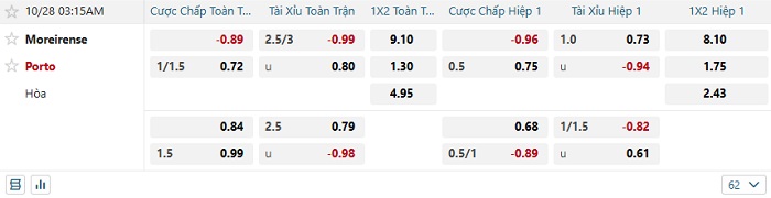 Tip kèo Châu Á hiệp 1 Moreirense vs Porto