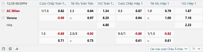 Tip kèo Châu Á hiệp 1 AC Milan vs Verona
