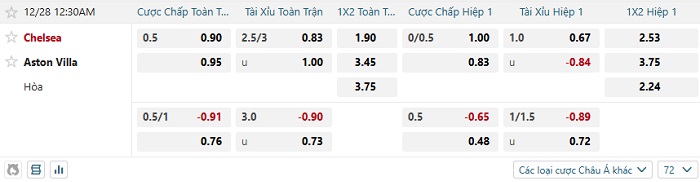 Tip kèo Châu Á full trận Chelsea vs Aston Villa