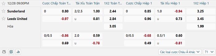 Tip kèo Châu Á full trận Sunderland vs Leeds