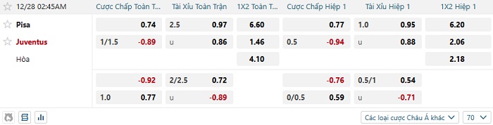 Tip kèo Châu Á full trận Pisa vs Juventus