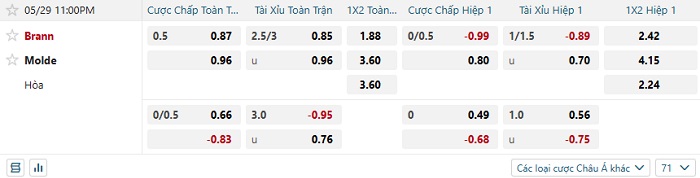 Tip kèo Châu Á hiệp 1 Brann vs Molde