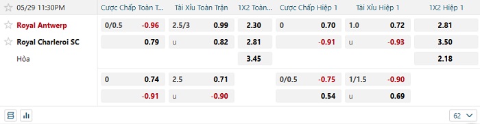 Tip kèo Châu Á hiệp 1 Royal Antwerp vs Royal Charleroi