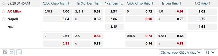 Tip kèo Châu Á full trận Milan vs Napoli