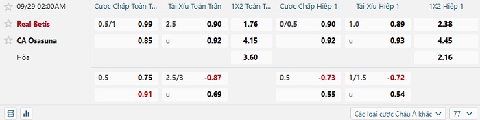 Tip kèo Châu Á hiệp 1 Real Betis vs Osasuna