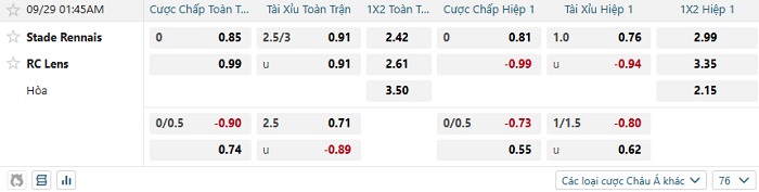 Tip kèo Châu Á full trận Rennes vs Lens