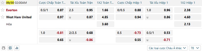 Tip kèo Châu Á full trận Everton vs West Ham