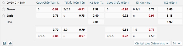 Tip kèo Châu Á hiệp 1 Genoa vs Lazio