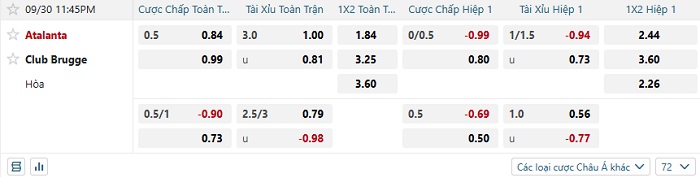 Tip kèo Châu Á hiệp 1 Atalanta vs Club Brugge