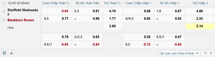 Tip kèo Châu Á hiệp 1 Sheffield Wed vs Blackburn