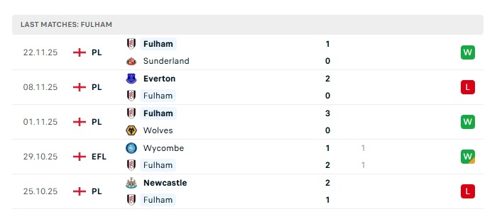 • Phong độ gần đây Fulham