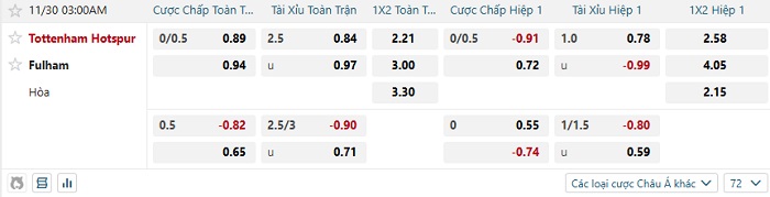 Bảng kèo bóng đá Tottenham vs Fulham