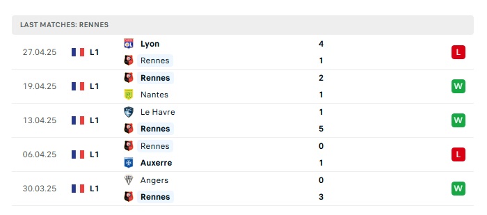 - Phong độ gần đây Rennes