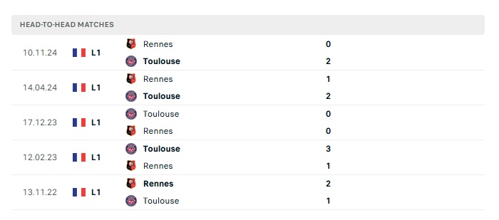 Lịch sử đối đầu Toulouse vs Rennes
