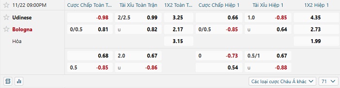 Soi kèo châu Á, kèo Udinese vs Bologna