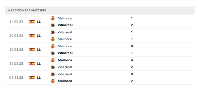 Lịch sử đối đầu Villarreal vs Mallorca