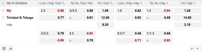 Bảng kèo bóng đá Mỹ vs Trinidad & Tobago