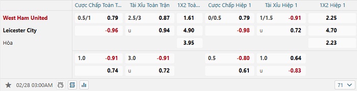 Bảng tỷ lệ kèo bóng đá West Ham Utd vs Leicester City