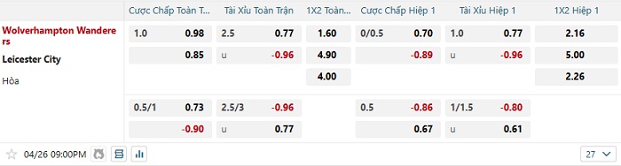 Bảng tỷ lệ kèo bóng đá Wolves vs Leicester City